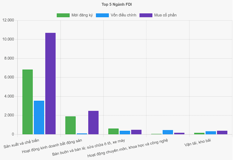 Ba ngành công nghiệp hàng đầu này cùng nhau chiếm 90,7% tổng giá trị FDI.